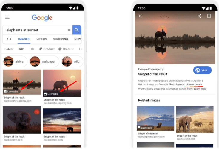 כך תראה תמונה בגוגל תמונות כאשר בעל האתר יישם את ההנחיות והוסיף את הרכיב הקשור לרישוי: