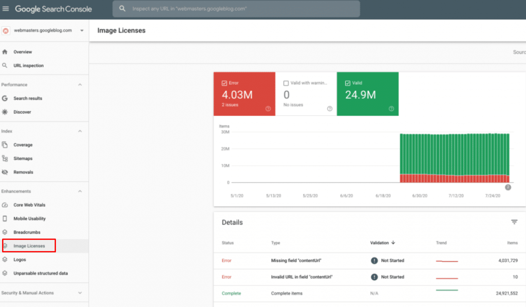 בסוף חודש יולי 2020, פרסמה גוגל בחשבון הטוויטר של Google Webmasters כי ניתן לראות נתונים ב-Search Console המתקשרים להטמעת רכיב ה-license בסכמת ImageObject.
