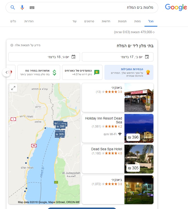 - אי רלוונטיות למידע המוצג מצג גוגל – ניתן לראות בצילום המסך מטה כי בחיפוש אחר 'מלונות בים המלח' גוגל מציגים במנוע חיפוש המלונות, מלונות הממוקמים רק בצד הירדני של ים המלח. רוב הגולשים בישראל, המחפשים מלונות בים המלח, מעוניינים לנפוש במלון בצד הישראלי ולכן יכולים שלא לפנות ולמנוע ולגלול מעט מטה לתוצאות האורגניות והרלוונטיות לחיפוש.