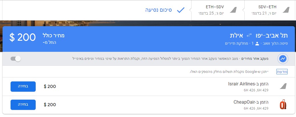 לאחר שהגולש בוחר את כל המאפיינים הרצויים לו, הממשק מציע מספר כרטיסי טיסה לפי זמני טיסה לימים שבחר. הגולש בוחר את הכרטיס הלוך וחזור ולאחר מכן עובר לעמוד המרכז את הבחירות + הצעות לרכישת כרטיסי הטיסה באתרי ספקים.