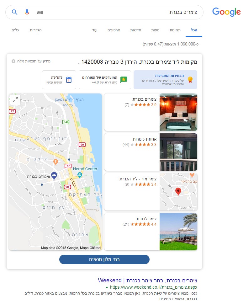כך קורה גם בחיפוש אחר מלונות. - מבחינת אנשי PPC – במקרים רבים בחיפושים תחרותיים כמו 'צימרים בכנרת' גוגל ממקמים את מנוע חיפוש המלונות שלהם בראש העמוד וללא מודעות google ads. המודעה הראשונה מופיעה בעמוד השני של תוצאות החיפוש. זוהי פגיעה קשה באתרים המשקיעים בתקציב ממומן. המטרה של גוגל היא שהמשקיעים יפנו את תקציבם למודעות בתוך מנוע חיפוש המלונות ולא בעמוד תוצאות החיפוש. נראה כי גוגל מבצעים בדיקות נראות לעמוד תוצאות החיפוש הראשון כאשר בחזרה על הביטויים שנבדקו לעיתים הופיעו מודעות google ads יחד עם המנוע ובמקרים אחרים המנוע הופיע לבד והמודעות בעמוד השני.