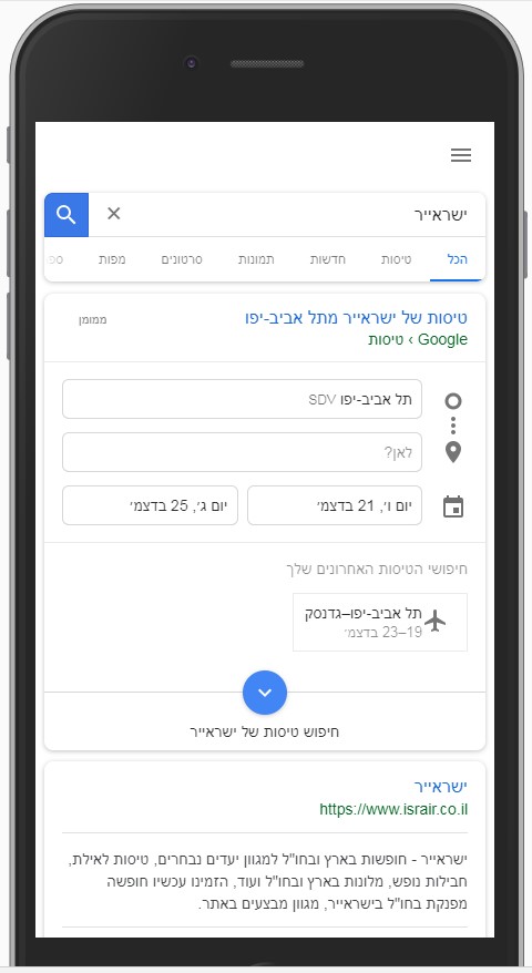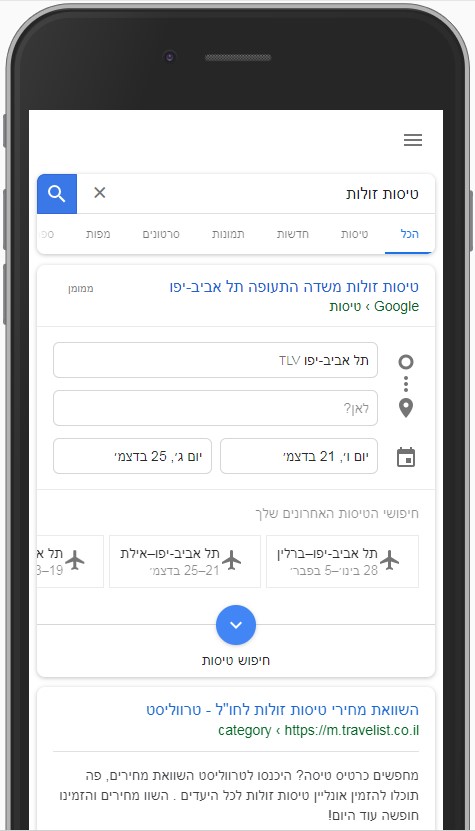 - השתלטות על ביטויים גנריים – גוגל ממקמת את מנועי חיפוש המלונות והטיסות במקומות הראשונים (ללא מודעות google ads) בעיקר על ביטויים כליים כמו טיסות, מלונות, טיסות זולות ועוד. לביטויים אלו יש תחרות גדולה!