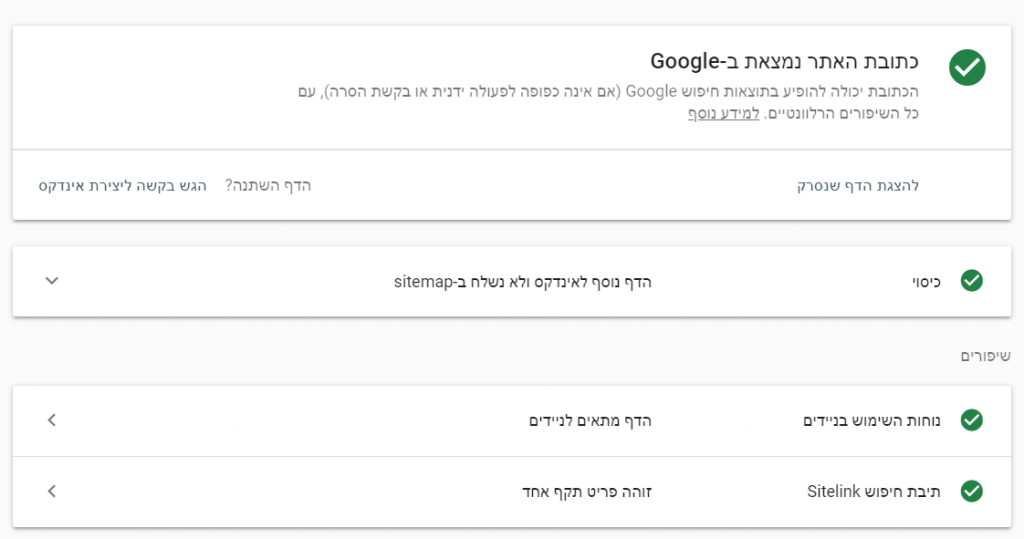 האפשרות הזו נמצאת תחת "בדיקת דף" בתפריט הצדדי של הסרצ' קונסול. תוצאה תקינה אמורה להיראות כך: