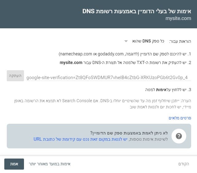 אימות של אתר ברמת הדומיין דרך עדכון רשומה אצל הרשם (בלי לפגוע בקישור שבין האתר לדומיין) מאפשר לנו לאמת באופן אוטומטי גם את כל הסאב דומיינים שלו ולראות נתונים מאוחדים. אם אנחנו מאמתים בכל דרך אחרת, עלינו להיכנס לכל סאב דומיין בנפרד ולאמת אותו, ואז הנתונים יופיעו בנפרד.