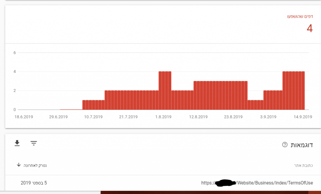 העמודים עצמם יהיו מקובצים לפי שגיאות כמו למשל "תג noindex" או שגיאות שרת מסוימות. לחיצה על כל שגיאה תביא מספר דוגמאות לדפים שהושפעו (מפאת מקום רואים רק את הכתובת הראשונה):
