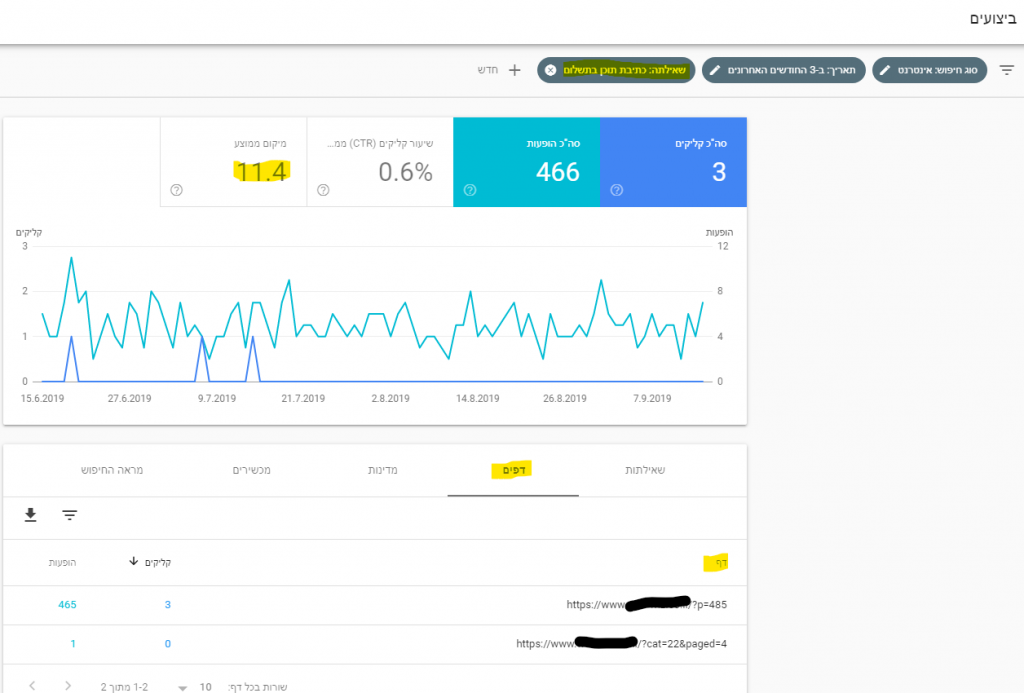 שיפור אחוז הלחיצות הוא עוד אספקט חשוב ביותר מכיוון שגם עמוד שזוכה להמון צפיות לא יהיה אפקטיבי אם לא יכנסו אליו כמעט גולשים. כדי לזהות עמודים עם אחוזי כניסות נמוכים, אבל כאלו שנמצאים במקומות גבוהים, נחזור לדוח הראשי ונבצע את מה שביצענו קודם. ההבדל שהפעם נשלב בין העמודות של "שיעור קליקים (CTR)" ומיקום ממוצע.