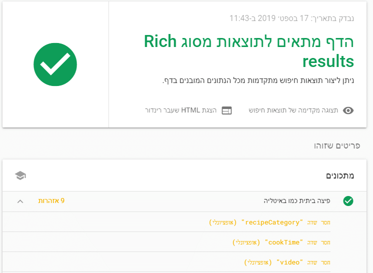 למרבה המזל, את המידע המובנה אנחנו יכולים לבדוק גם כן דרך אחד הכלים של גוגל, בעבר הוא היה בתוך הסרצ' קונסול (ולכן הוא רלוונטי לכאן), אבל נכון להיום תצטרכו לגשת לשם ישירות. אם נכניס כתובת של דף שיש בו כבר מידע מובנה מוטמע, נוכל לראות אם יש פרמטרים מסוימים שאנחנו מפספסים. אם אין בדף מידע מובנה, עדיין נוכל לראות אם אפשר להטמיע בו מידע כזה.