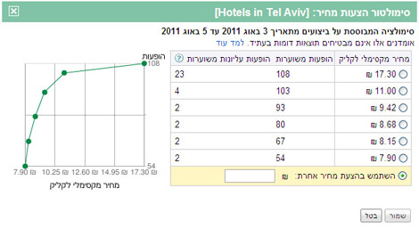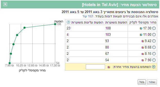 יציג מספר הופעות והופעות עליונות משוערות ביחס לעלות קליק שנזין. יש מקרים בהם ההבדל בין מדרגה אחת לאחרת הוא בעיקר בכמות ההופעות העליונות.