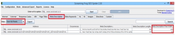 כמו בתג TITLE, גם לתג ה Description יש תפיסה חדשה, במקום כלל אצבע של עד 175 תווים או 168 תווים (תלוי את מי שואלים), גוגל מתייחסת לשטח של 923 פיקסלים. לאור זאת, ב screaming frog ניתן לסנן עמודים שחורגים מעל 923 פיקסלים. שימו לב, כאשר גוגל מציגה תמונה (על ידי שימוש בתג "Rel=”author) לצד התוצאה היא מצמצמת למעשה את גודל השטח של הטקסט.