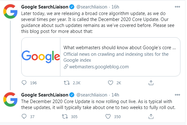 גוגל הכריזו על עדכון הליבה של דצמבר 2020 ("December 2020 Core Update"). העדכון התחיל להיכנס לתוקף ביום חמישי בערב, סביב השעה 20:00 שעון ישראל. לדברי אנשי גוגל, עד שהעדכון יופעל במלואי יקח בין שבוע לשבועיים.