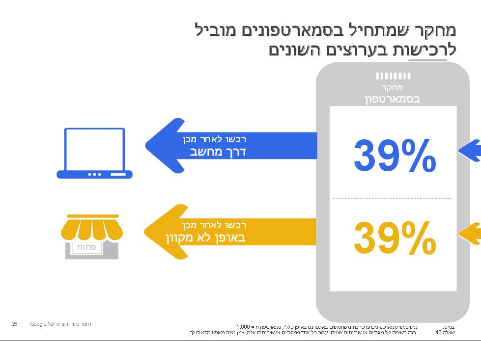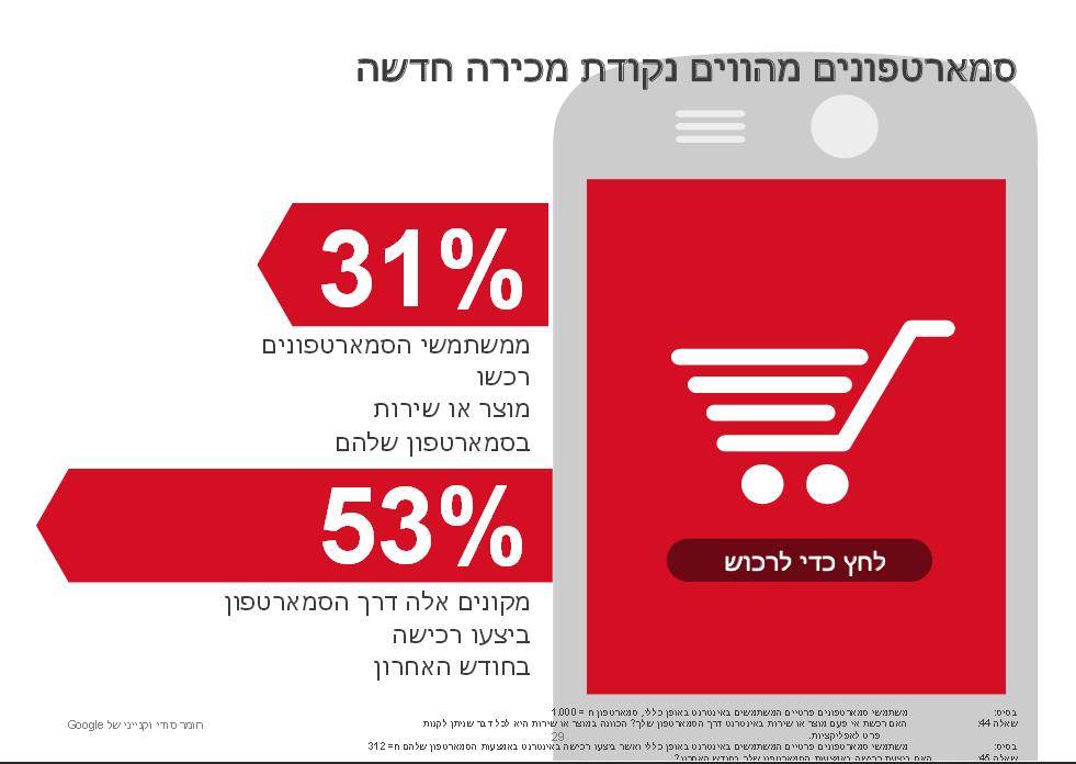 לפי נתונים של גוגל על צריכת המובייל בישראל נכון למאי 2013: סמארטפונים מהווים נקודת גישה עיקרית לחיפוש, 64% מבצעים חיפוש בסמארטפונים שלהם בכל יום. 95% ממשתמשי סמארטפונים משתמשים בהם עבור מידע לוקאלי ו- 92% נוקטים פעולה כתוצאה מכך (רכישה או יצירת קשר עם העסק), 78% ערכו מחקר לגבי מוצר או שירות בטלפון שלהם ו- 31% ממשתמשי הסמארטפונים ביצעו רכישה במובייל שלהם.