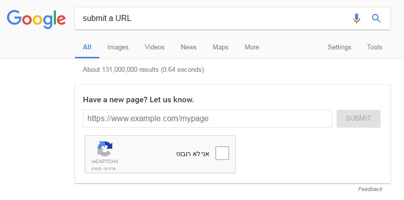 כל מה שצריך הוא להתחבר עם חשבון מייל לדפדפן כרום ולכתוב בשורת החיפוש submit a URL. גוגל יציג לכם ישירות בתוצאות החיפוש טופס להגשת כתובות חדשות לסריקה – נגיש, זריז ונוח.