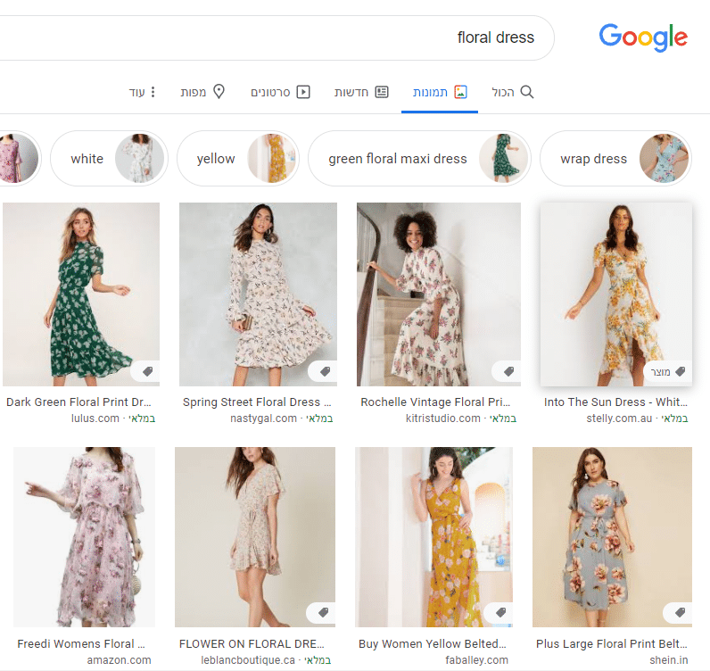 ניתן לראות כי בשאילתה “floral dress” כי יש נבדלות ויזאולית בין התמונות אך יש חיבור רלוונטי לשאילתה של הגולש.