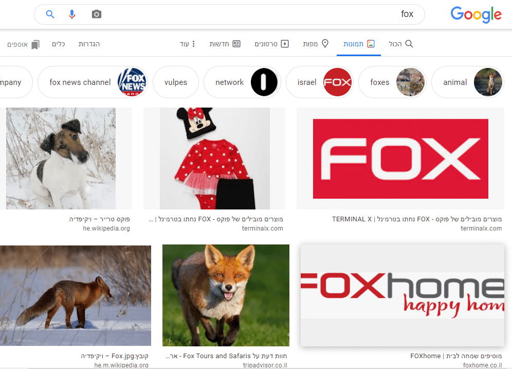 דוגמא ראשונה – הביטוי “fox” – מציג תמונות של שועל כחיה ושל חברת fox הישראלית.