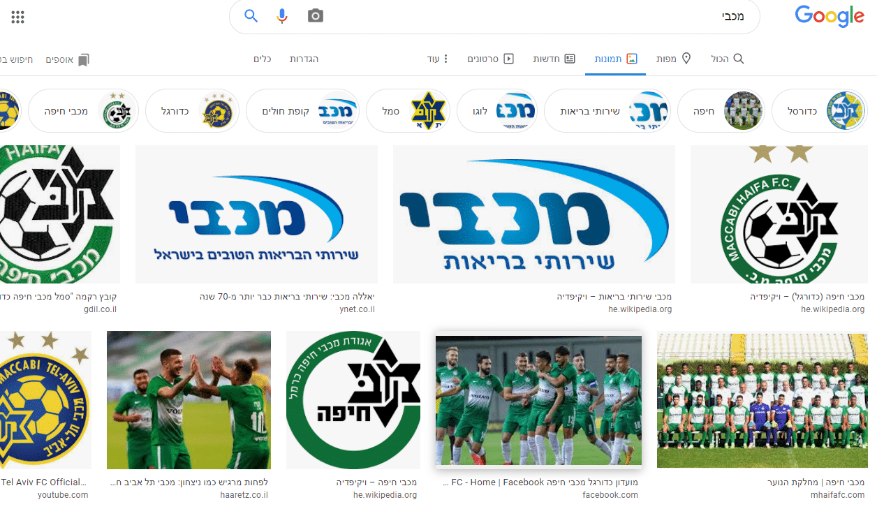דוגמא שניה – הביטוי "מכבי" – מציג תמונות של קופת חולים מכבי ושל קבוצות הספורט מכבי חיפה, מכבי תל-אביב (כדורגל וכדורסל) עם יכולת לסנן בטאב הסינונים.