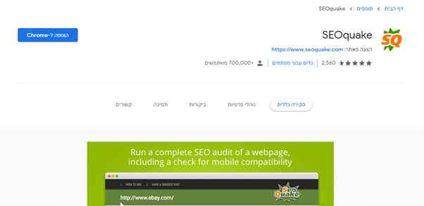 SEOQuake הוא תוסף לדפדפן המאפשר לבצע בדיקת צפיפות מילות מפתח כדי להבין האם בדפי האתר שלכם יש דחיסות מילות מפתח נמוכה או דווקא גבוהה מדי. התוסף מציע בנוסף לקבל מידע בסיסי מבחינתSEO על האתר לדף ספציפי, כמו כותרות משנה, לינקים יוצרים וכו'