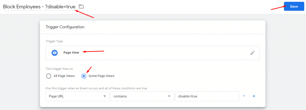 ב-Trigger Configuration נגדיר Trigger Type מסוג Page view, לפי Some Page Views ונבחר Variable של Page URL, contains, disable=true.