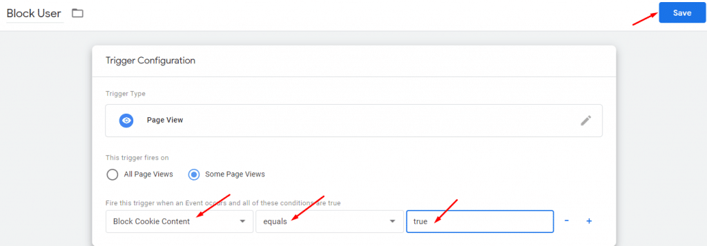 את Trigger זה נגדיר שוב לפי Page View ולפי Some Page View, אך הפעם נגדיר שהוא יירה אותו על בסיס ה-Variable שהגדרנו קודם בשם "Block Cookie Content", ואז equals ולפי הפקודה של הפרמטר true ולאחר מכן נשמור – Save.
