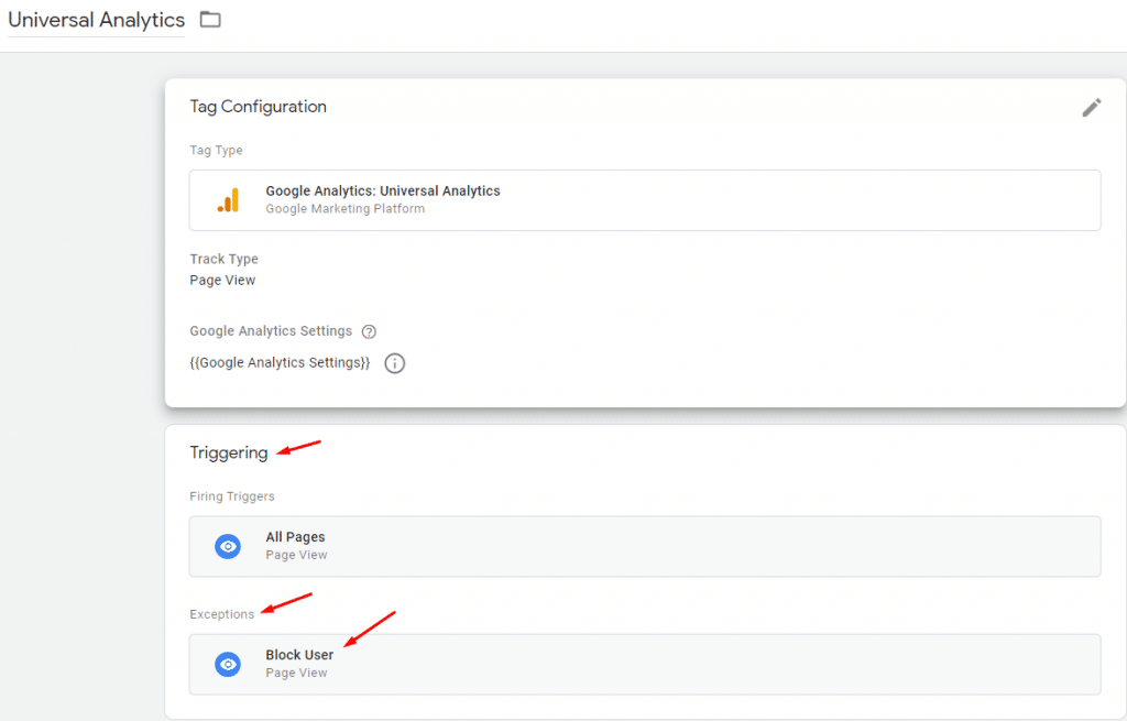 נכנסים ל-tag הקיים של Google Analytics ומוסיפים בחלק התחתון באזור ה-Triggering מוסיפים תחת אזור Exceptions את ה-Trigger שיצרנו בשם Block User (שם שרירותי שבחרנו להגדיר במדריך).