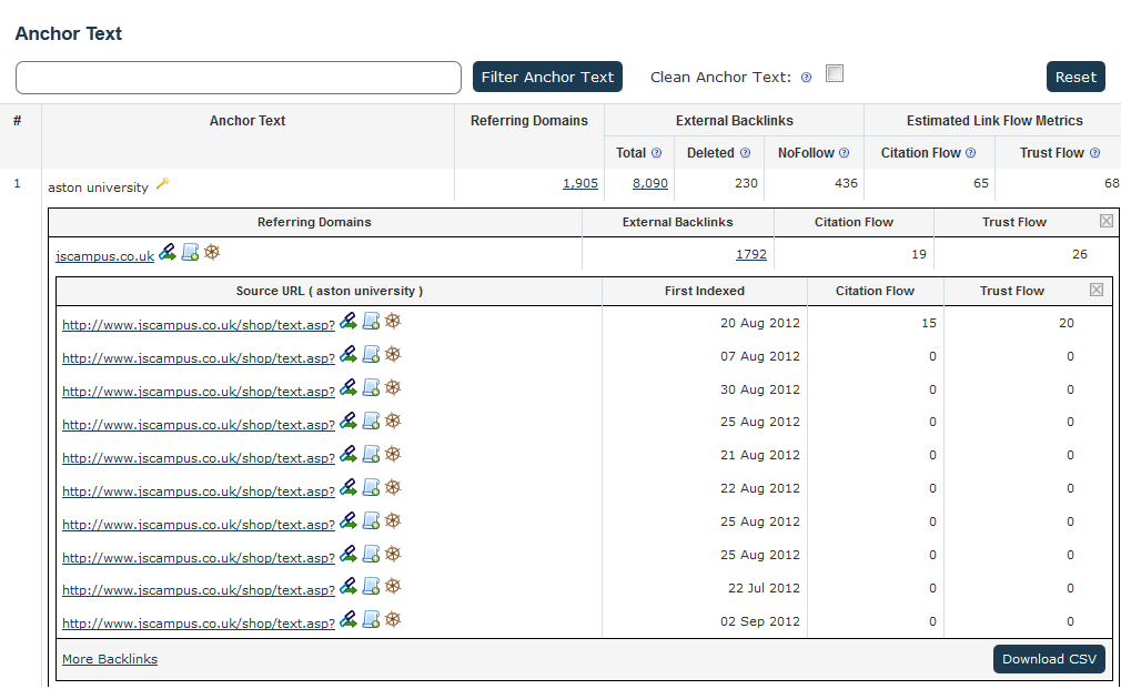 חידוש נוסף ש-Majestic מציעים, הוא דו"ח התפלגות טקסט העוגן של הקישורים הנכנסים. גם דו"ח זה יכול להיות מאוד שימושי בהיבט של ניתוח הקישורים הנכנסים לאחר עדכון הפינגווין. הכלי מאפשר לסנן חלק מהנתונים (במידה ויש צורך בכך) ולייצא את הנתונים ל-CSV, שם ניתן גם להפיק תרשים גרפי שיסייע להסיק מסקנות אופרטיביות.