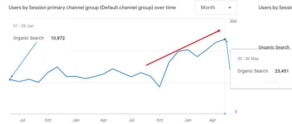 אנחנו עובדים, אנחנו למודי ניסיון (וממשיכים ללמוד) בעולם האיקומרס. כך נראה גרף תנועה אורגנית לאתר איקומרס מחודש יוני 2023 ועד חודש מאי 2024