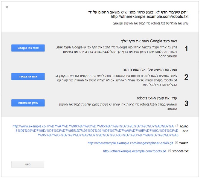 - יצירת קשר עם בעל האתר בבקשה להסיר את החסימה של המשאב בקובץ הרובוטים.